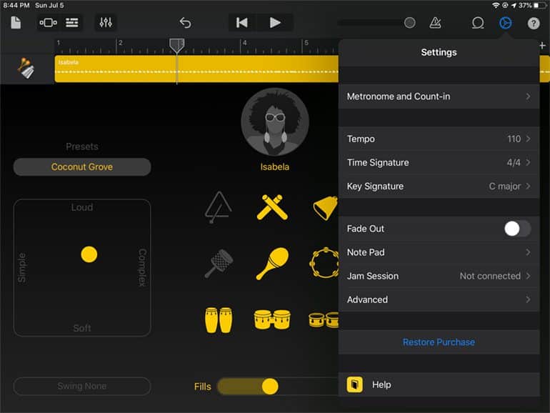 Let’s start with the Drummer. You can choose Acoustic, Electronic, or Percussion. Let’s go with Percussion. You can swipe across the pictures to get different kinds of drummers, but let’s go with Isabela. Before we play it, we should set the Tempo for your composition. Do you want it fast or slow? I’ll go with 120 beats per minute.