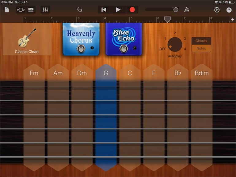 Now you have these tabs with letters on them. These are notes or chords. If you see something else, click where is says, Chords. To try this out hit the Play Key and just touch the letters and it will play a chord for you. Or, you can strum down the strings. If you want, you can add the chorus or echo effects.