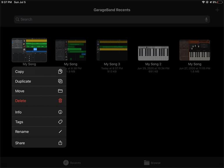 To do something with your files, hit the File icon (top left), click on your project (in this case MY Song), hit Share box with an arrow. It will give you a choice of Song, Ringtone, or Project. (I know, you are thinking right now about making a new ringtone, right?) If you select Song, you can open it as an audio track in Final Cut or whatever. If you hit Project, you can open the project to better mix it in Garage Band on the Mac. You can email the file to yourself or send it to Dropbox or iCloud, or AirDrop.